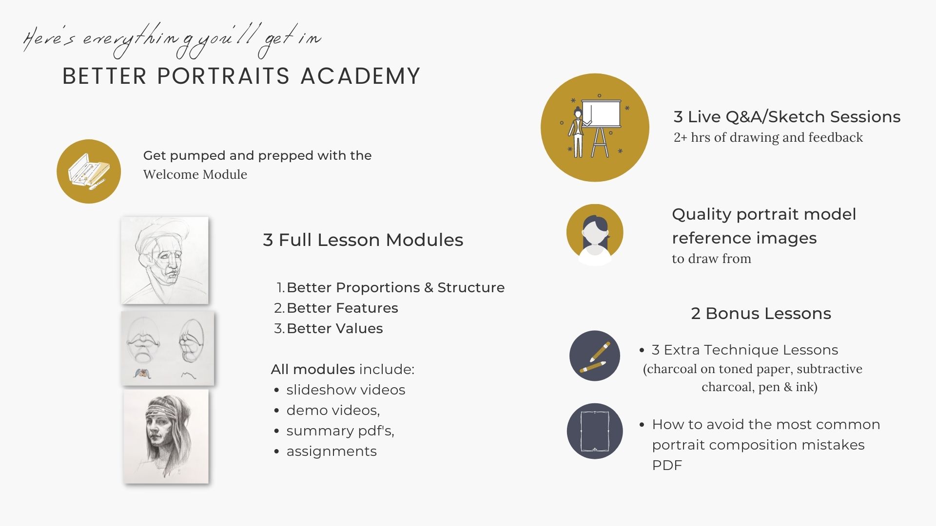 “I really love Carolin's courses! Starting from gestures through to the final drawing. I am now equipped with a solid drawing process that will always remain with me; as part of my art skills toolbox and creative endeavours. Initially, I watched and drew along with Carolin’s sketch sessions on YouTube. The Better Drawings Academy 8-week course was over and above my expectations! Carolin’s depth of knowledge and her wonderful ability to teach takes you through a journey. Through slide-shows, demonstrations, practical assignments, Live questions & answers and draw-along sessions that encourage you to really grasp and understand the fundamental drawing process and then add all it’s beautiful nuances.”